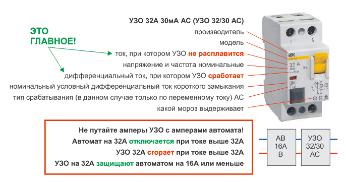 Устройство защитного отключения (УЗО) = устройство защитного отключения, управляемое дифференциальным (остаточным) током (УЗО−Д) = выключатель дифференциального тока (ВДТ) — механический коммутационный аппарат или совокупность элементов, которые при достижении (превышении) дифференциальным током заданного значения при определённых условиях эксплуатации должны вызвать размыкание контактов. Может состоять из различных отдельных элементов, предназначенных для обнаружения, измерения (сравнения с заданной величиной) дифференциального тока и замыкания и размыкания электрической цепи (разъединителя). Фото УЗО (ВДТ). Классификация УЗО (ВДТ). Принцип работы. Характеристики. Маркировка. Обозначения на корпусе. Наглядная мнемокартинка по подбору УЗО (ВДТ) в "связке" АВ+УЗО (от Avs7153) Наглядная мнемокартинка, поясняющая принцип работы УЗО (ВДТ) (от olegaa2) Схемы подключения.